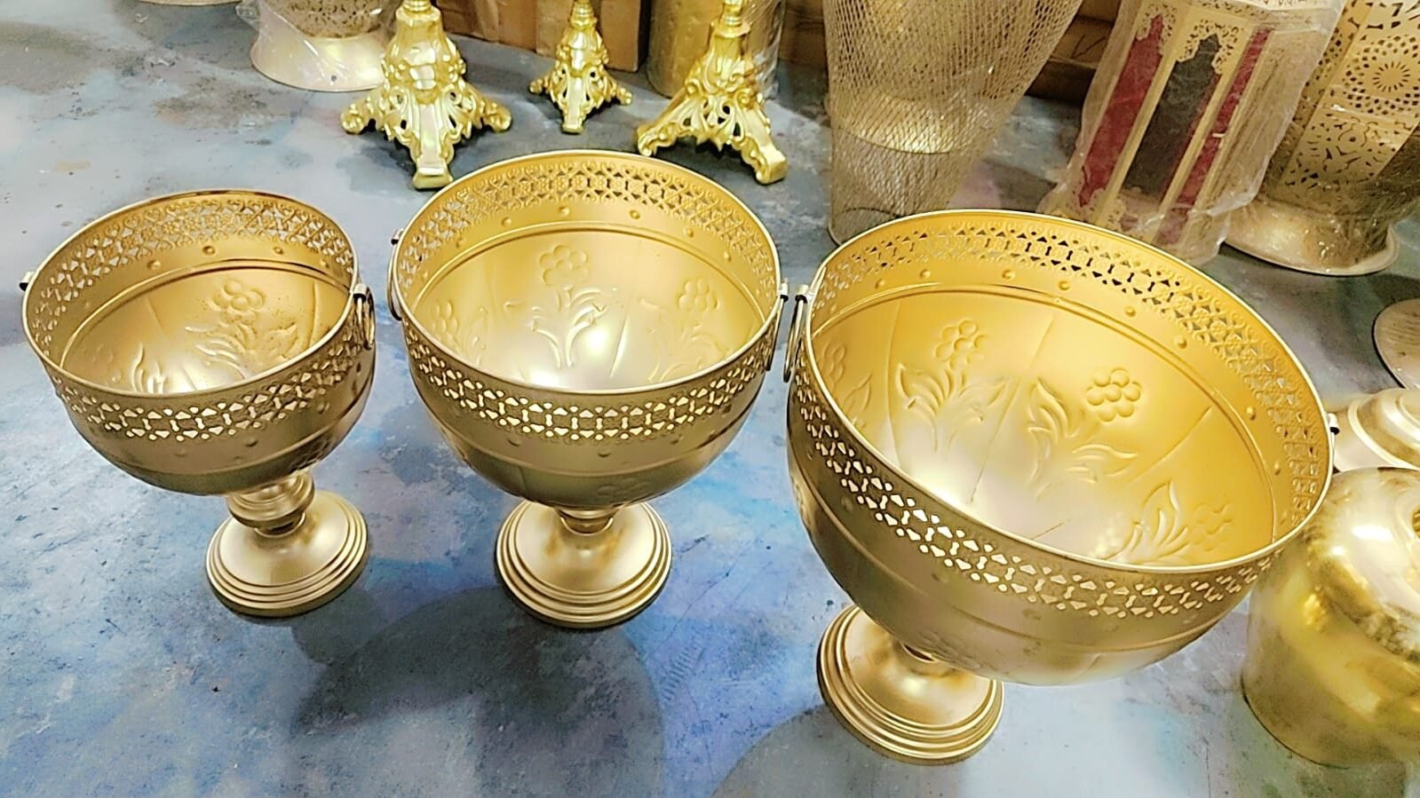 Urli is a beautiful vastu object in the structure of bowl which is generally placed at home by filling water in it for Goodluck and prosperity in your house. Stars can’t shine without darkness and you can’t enjoy the candle light ambiance without having this multi purpose product which floor as a welcoming urli. Package Contains (Total 9 Pcs) : – 1 Large Urli-12 Inch 1 Medium Urli – 10 Inch 1 Small Urli – 8 Inch 3 Diya – 4 Inch 1 Large Stand – 16 Inch 1 Medium Stand – 14 Inch 1 Small Stand – 12 Inch Weight – 3200GR Material – Iron
