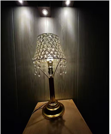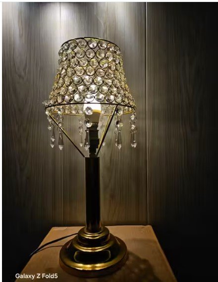 Add elegance and warmth to your living space with this beautifully crafted crystal table lamp. Designed with a unique apple shape, it combines brass, crystal, plastic, and metal to create a luxurious yet subtle charm. The digits on the integrated clock are clear and easy to read, enhancing both utility and visual appeal.